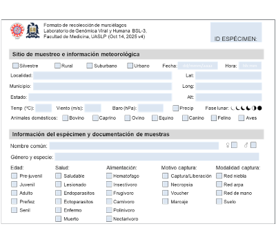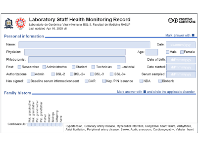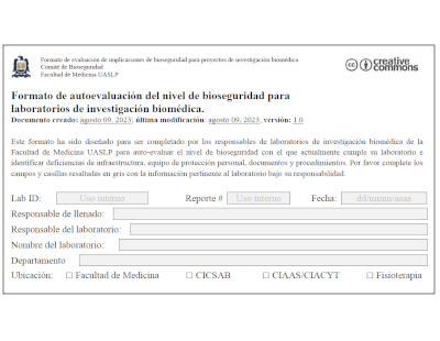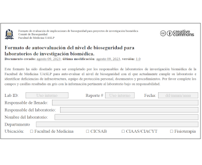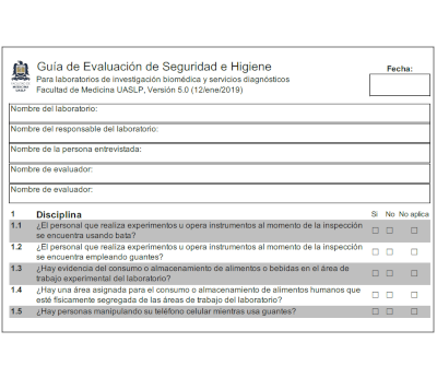 Laboratory biosafety guideline compliance self-assesment form. This document, developed for use by the Biosafety Committee of the UASLP School of Medicine, serves as a self-assessment tool for laboratory personnel to evaluate their adherence to biosafety guidelines and regulatory requirements. Through the systematic review of procedures, equipment use, and containment practices, users can identify both strengths and areas for improvement. Its routine application supports a proactive approach to safety and promotes a culture of continuous compliance within our research environment.