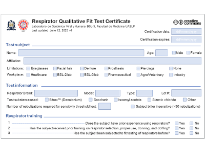 Respirator qualitative fit test certificate. This certificate serves as official documentation that the individual named herein has successfully completed a qualitative fit test for an N95 respirator in accordance with the requirements set forth by OSHA 29 CFR 1910.134 and relevant Mexican occupational health regulations, including NOM-017-STPS-2024 and NOM-116-STPS-2009. The fit test verifies that the selected respirator model provides an adequate facial seal under simulated working conditions. Certification is valid for one year from the date of testing, after which re-evaluation is required to ensure continued respiratory protection.