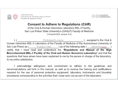 Consent to adhere to laboratory regulations (CAR) form. This document outlines the responsibilities and guidelines all lab personnel, visiting researchers, and other individuals must follow to ensure a safe, productive, and ethically compliant research environment. It covers essential topics such as safety protocols, proper use of equipment, and respect for confidentiality, emphasizing the importance of maintaining professional conduct at all times. By agreeing to these terms, participants affirm their commitment to upholding the highest standards of integrity and contributing to our lab’s collaborative and secure atmosphere.