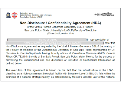 To protect sensitive data, proprietary methodologies, and confidential research activities conducted within the laboratory, all staff, collaborators, and visitors are required to sign a Non-Disclosure Agreement (NDA). The NDA signature log serves as an official record confirming each individual's legal and ethical obligation to maintain confidentiality. This measure safeguards intellectual property, ensures compliance with institutional and sponsor requirements, and reinforces trust in collaborative and regulated research environments. |