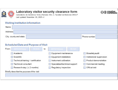 Laboratory visitor security clearance form. This form collects essential information and security clearance requirements from all prospective laboratory visitors, external researchers, and temporary personnel seeking access to our research facilities. It addresses critical security assessments including background verification, institutional affiliation confirmation, purpose of visit documentation, and acknowledgment of confidentiality obligations, ensuring that only authorized individuals gain entry to sensitive research areas. By completing this security clearance form, visitors provide necessary documentation for security review, consent to background verification processes, and formally agree to comply with all laboratory security policies, biosafety protocols, and confidentiality requirements during their authorized visit to our facilities.
