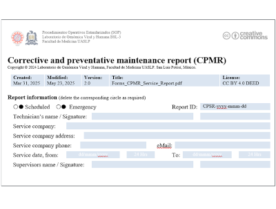 Corrective and preventive maintenance report (CPMR). This form is used to document scheduled or emergency maintenance, repairs, and updates performed on laboratory equipment and instruments. It captures key details including service type, technician and supervisor information, equipment identifiers, and descriptions of any issues encountered and actions taken. The CPSR ensures traceability, compliance, and operational continuity for all critical assets in the laboratory.