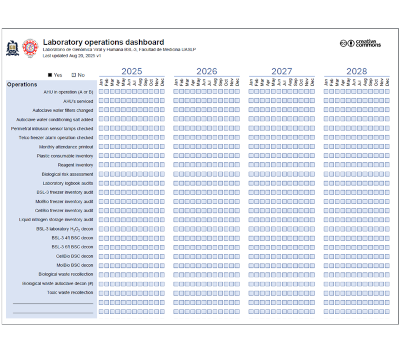 This dashboard provides an official monthly record of laboratory operations spanning the past four years. It consolidates key indicators related to equipment servicing, inventory management, biosafety audits and training, decontamination procedures, staff medical follow-up, certifications, and digital information backups, ensuring transparent oversight and accountability in compliance with institutional and regulatory standards. |